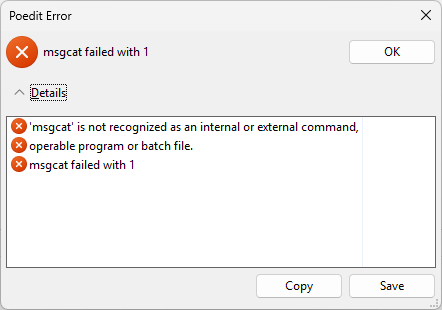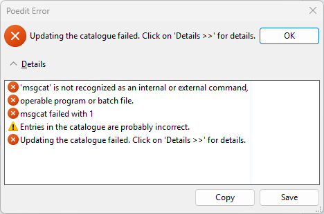 18/10/2025 15:48:26: 'msgcat' is not recognized as an internal or external command, 18/10/2025 15:48:26: operable program or batch file. 18/10/2025 15:48:26: msgcat failed with 1 18/10/2025 15:48:27: Entries in the catalogue are probably incorrect. 18/10/2025 15:48:27: Updating the catalogue failed. Click on 'Details >>' for details.