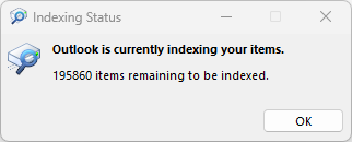 - Once I opened Outlook and viewed the indexing progress, the number of items pending to be indexed went up, and kept going up for a while. Indexed items started increasing aswell.